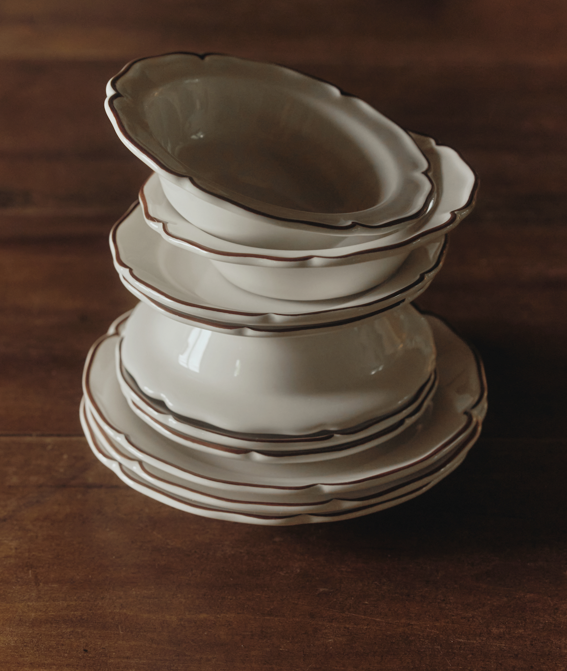 Inspired by the traditional Italian trattoria dish, we created our V.VM ceramic collection in white with a beautiful chocolate brown border for an informal yet elegant table setting.