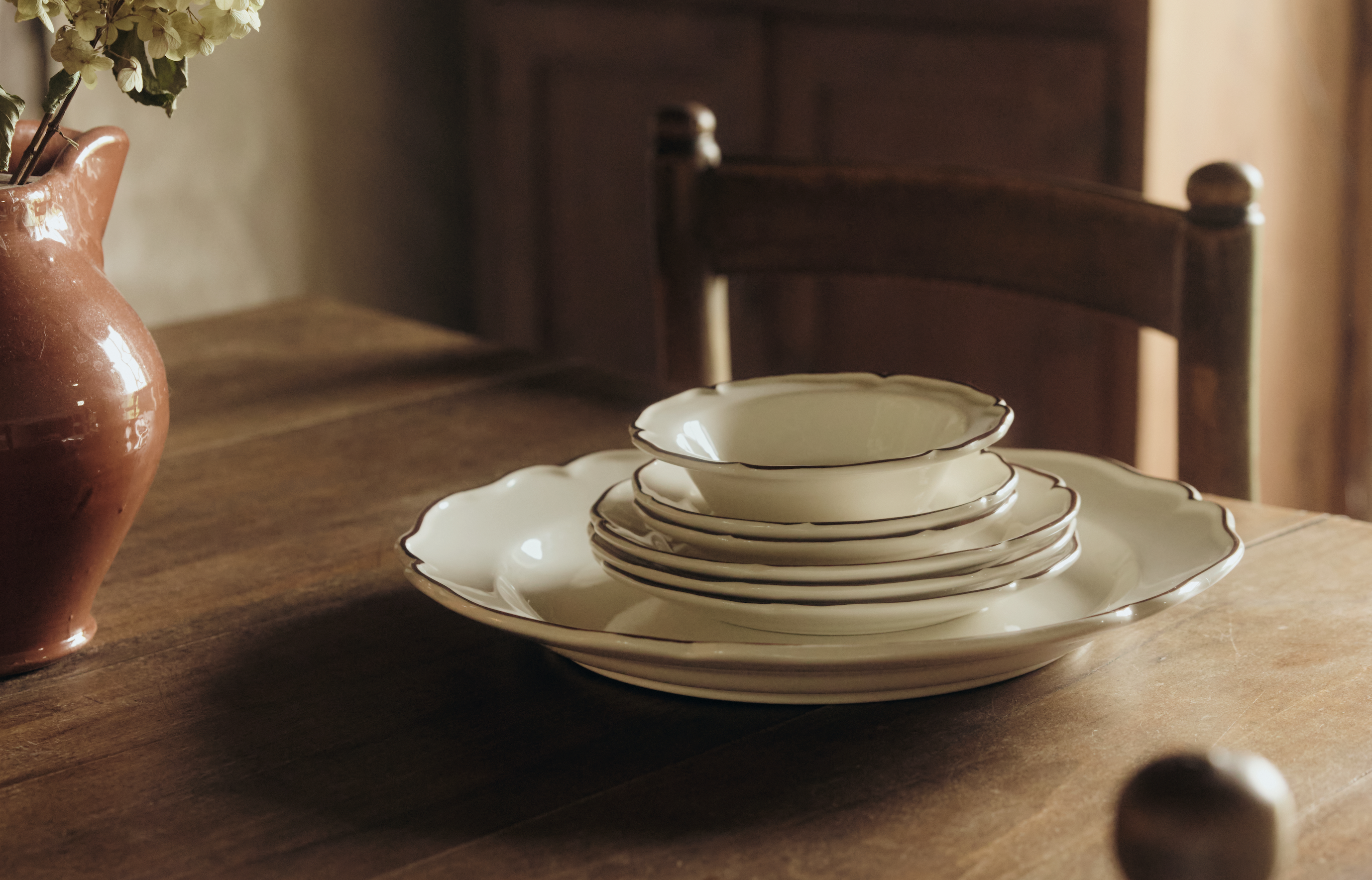 Inspired by the traditional Italian trattoria dish, we created our V.VM ceramic collection in white with a beautiful chocolate brown border for an informal yet elegant table setting.