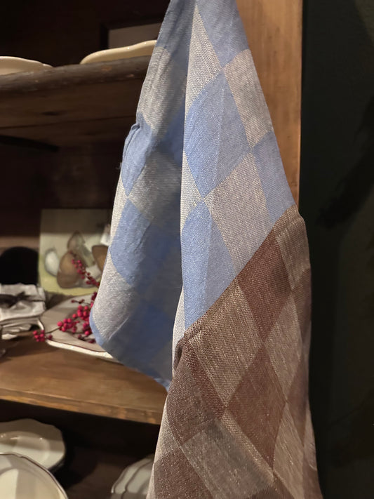 V.VM Double Check Linen Tea Towel - Light Blue & Chocolate Brown