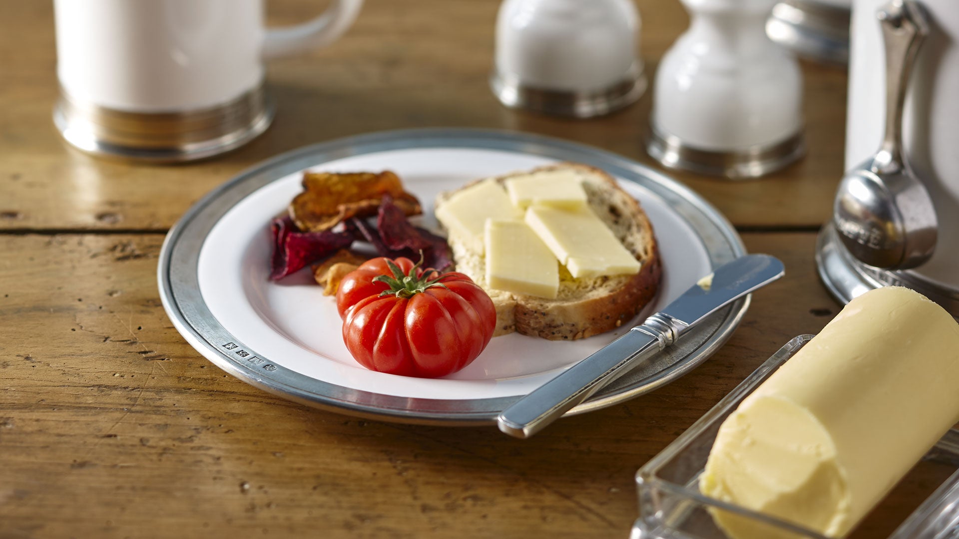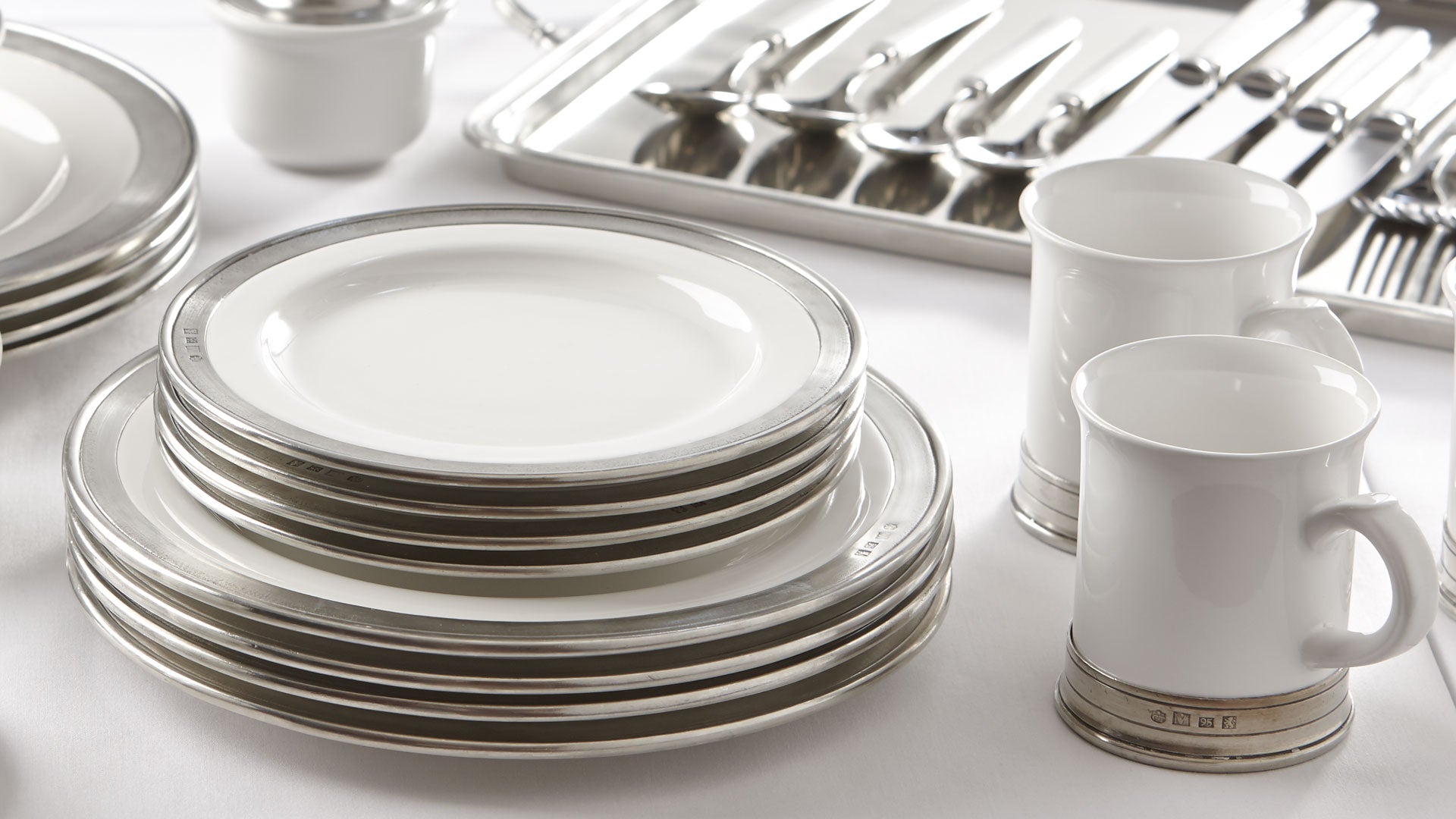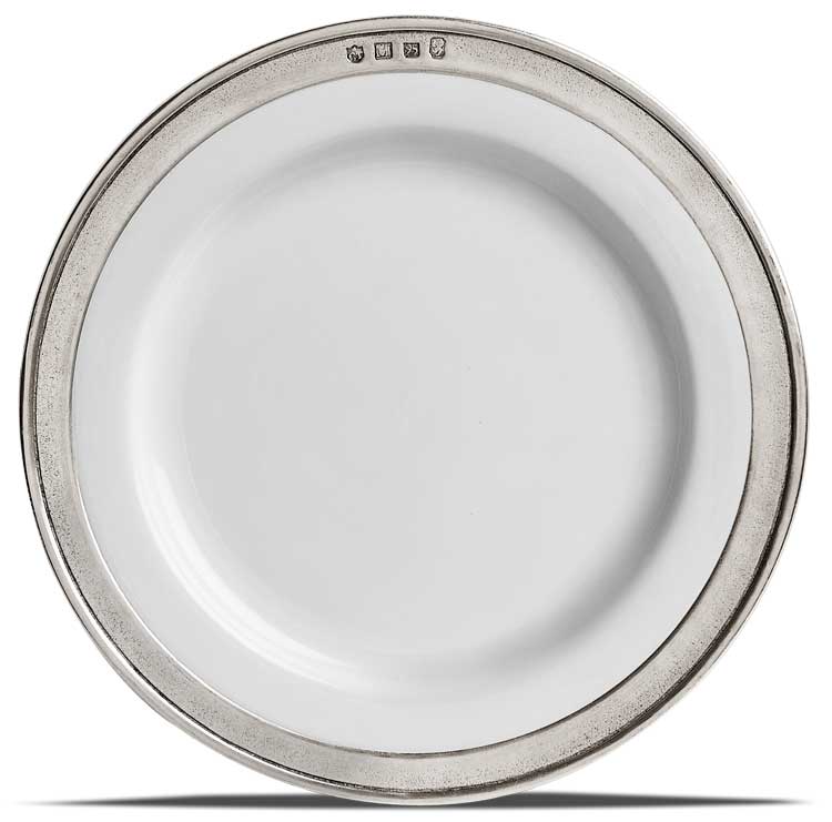 Questo elegante piatto piano in ceramica con bordo in peltro fa parte dell'ampia collezione Convivio. La collezione è il risultato di un lungo e meticoloso lavoro di progettazione, culminato nella sapiente unione di due materiali pregiati in un unico prodotto che ne esalta le caratteristiche.
