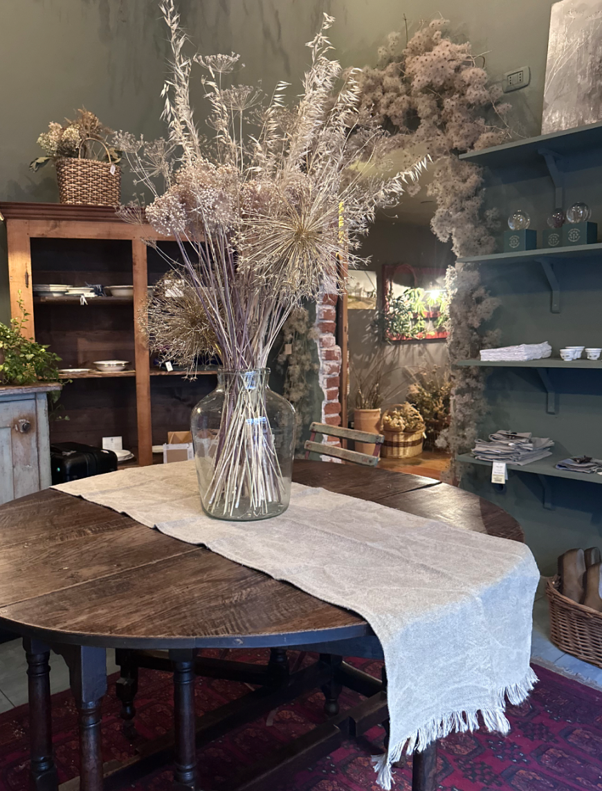 Realizzato in collaborazione con un laboratorio artigianale a conduzione familiare in Italia, questo runner in lino V.VM è realizzato in lino puro al 100%, tessuto su telai tradizionali con tecniche tradizionali. Il bordo sfrangiato conferisce al tessuto un'eleganza naturale e traspirabilità, conferendogli un morbido drappeggio e un fascino rustico e rilassato. Che sia disposto longitudinalmente sul tavolo o utilizzato come centrotavola per appendere ciotole e oggetti da collezione, dona una sobria raffinatezza a qualsiasi ambiente.