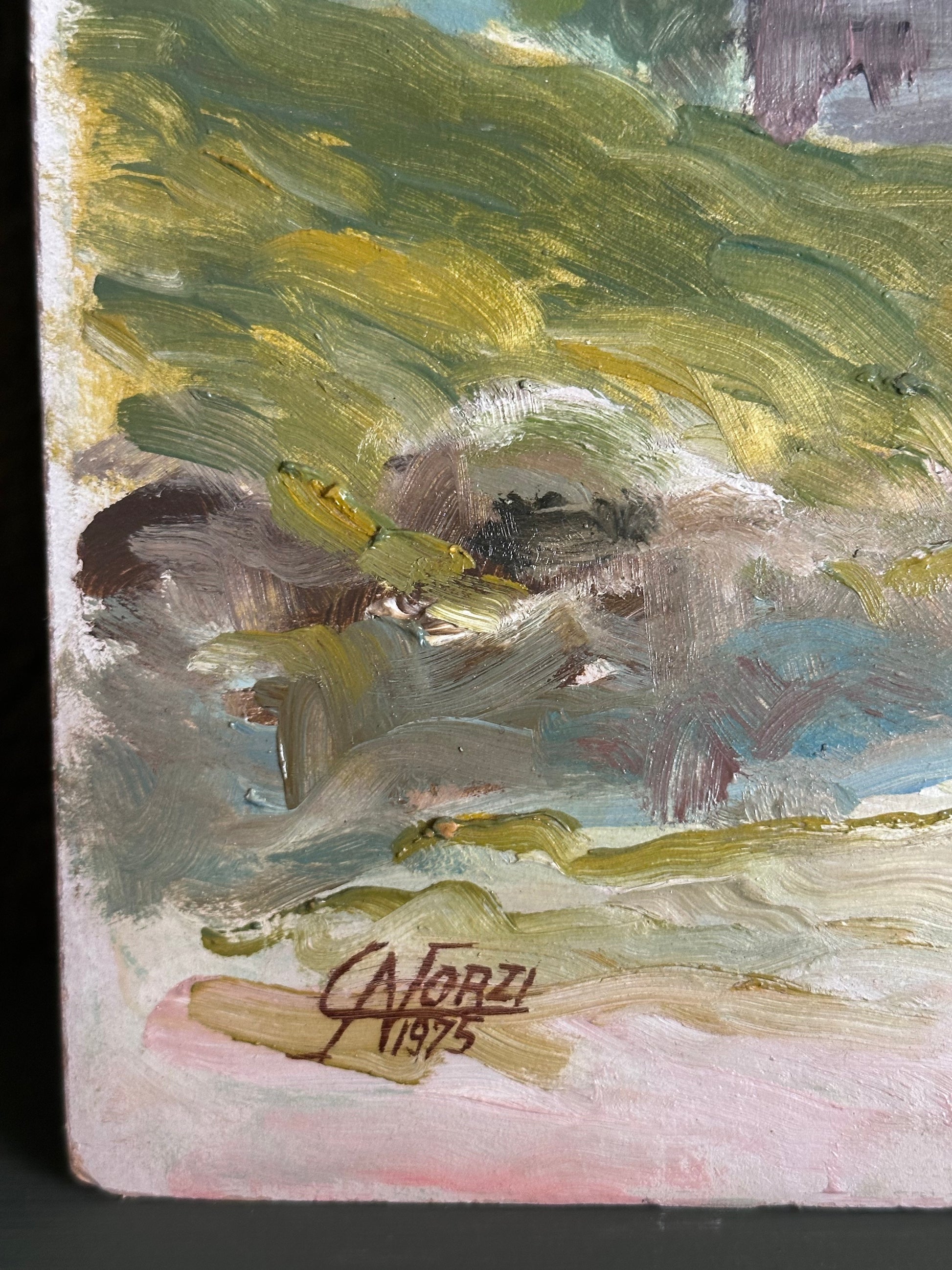 A timeless depiction of rural Italian life, this antique painting showcases a charming hillside church nestled within a small village, surrounded by majestic mountains. Rendered in soft, harmonious tones, the work evokes the peaceful spirit of the countryside and invites contemplation of simpler times. Signed by artist.