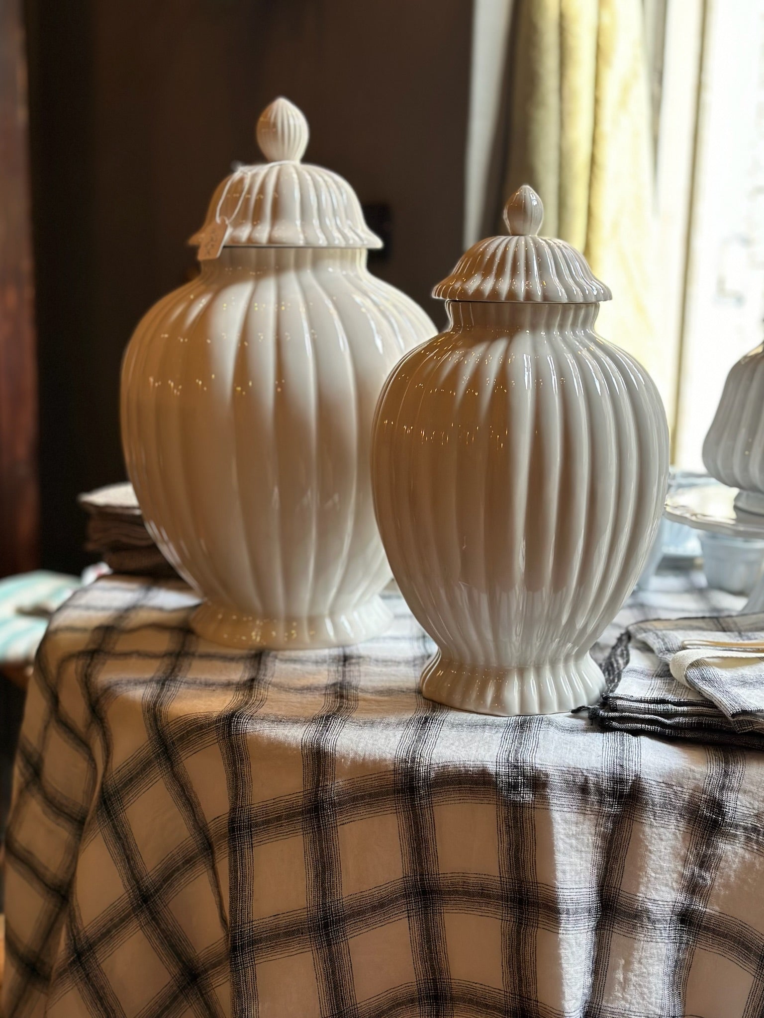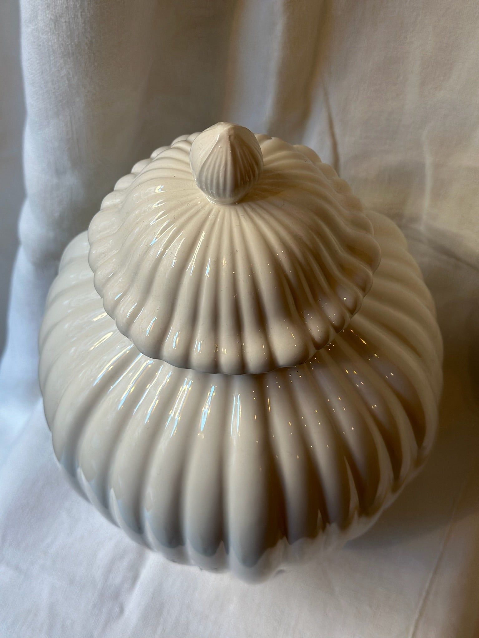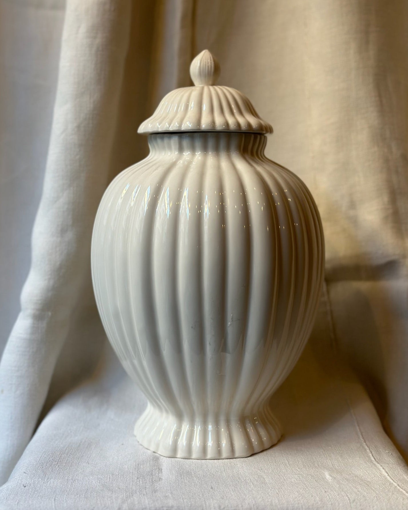 Discover timeless Italian craftsmanship with this exquisite ceramic jar, meticulously handmade in the heart of the Veneto region. Each piece begins with dark, locally sourced clay, skillfully shaped by artisan hands to achieve its elegant, sculptural form. The jar is then finished with a luminous white coating, creating a striking contrast that highlights its refined ridges and soft curves.