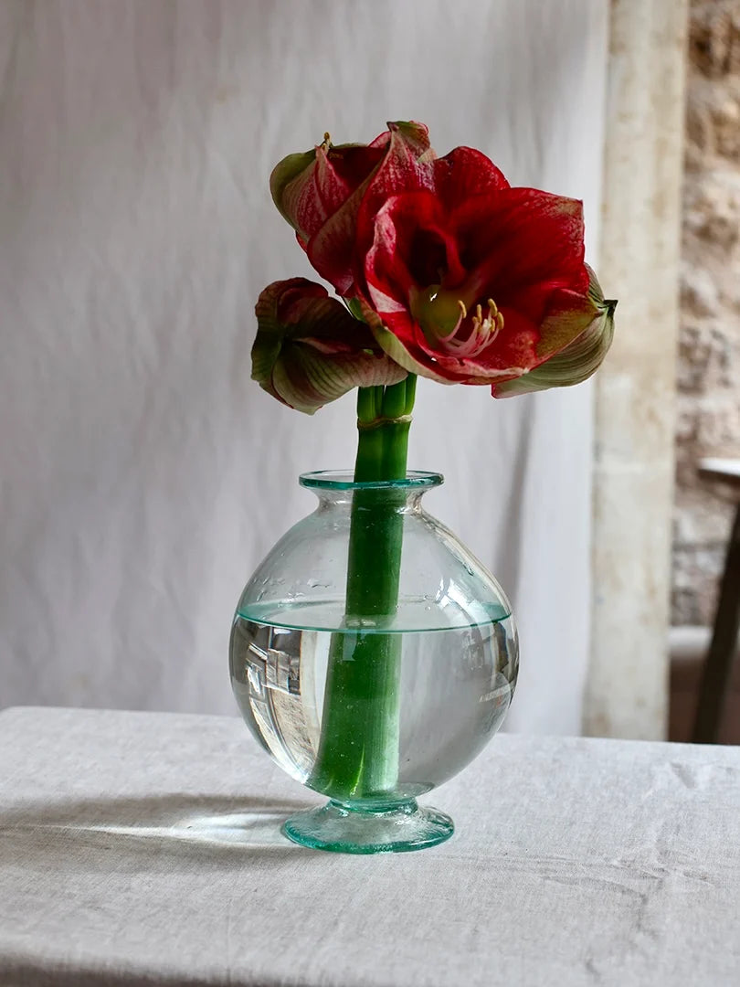 Vaso is vase in Italian! Buy yourself a colorful bouquet of flowers that remind you of the rolling hills of Tuscany, the cuisine of Umbria, and the paintings of Morandi. Giorgio Morandi was a famous still-life Italian painter born in Bologna at the end of the 20th century. He specialized in still-life compositions using oil paints with bottles, carafes, and everyday objects. As a painter herself, Valentina was inspired by Morandi to create a series of simple minimalist objects in mouth-blown recycled glass, crafted for your everyday use. Use Vaso as a vase but also as a food container. Its footed base will look good on any mantelpiece or table setting even with just one stem. Mouth-blown from transparent recycled glass by our expert artisans
