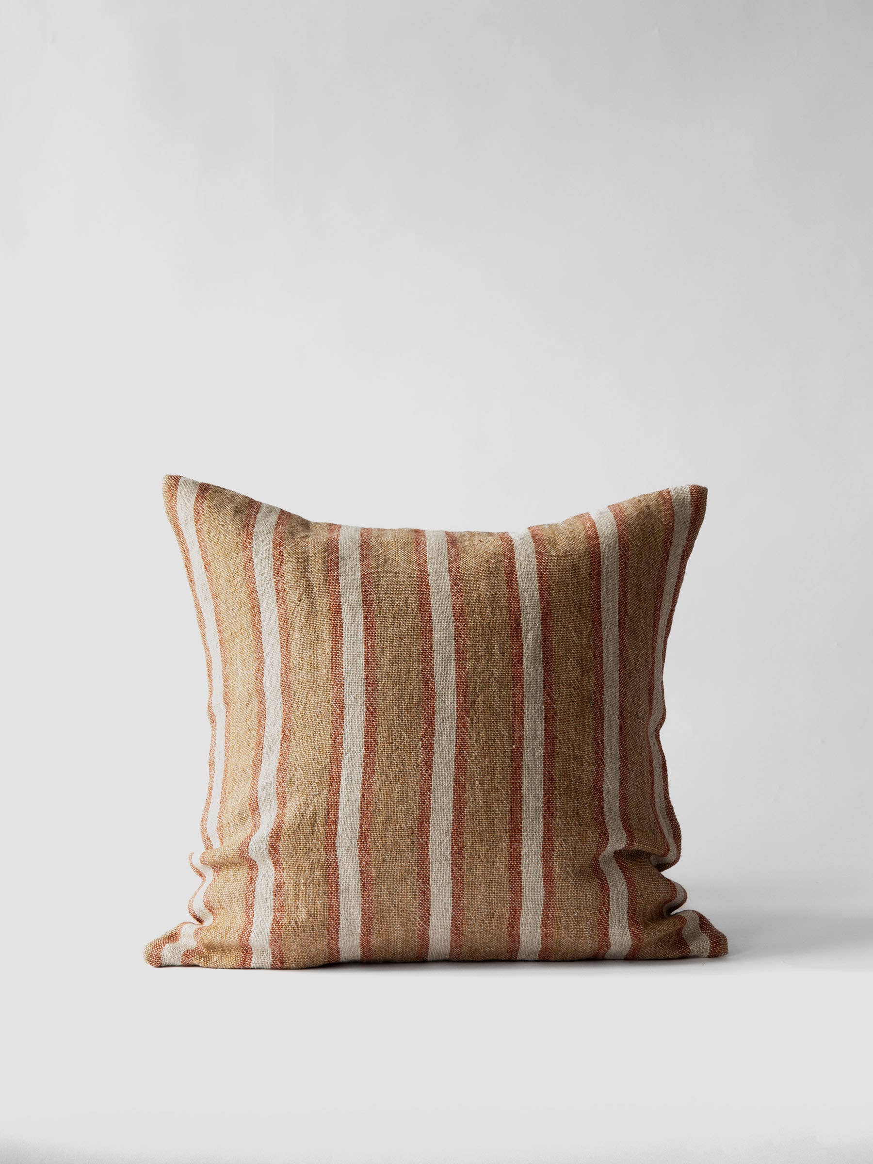 The Maurice design showcases elegant stripes in shades of brown, beige, and white, adding depth with its rich fabric variations. Ideal for enhancing sofas or beds, it pairs well with other decorative cushions.