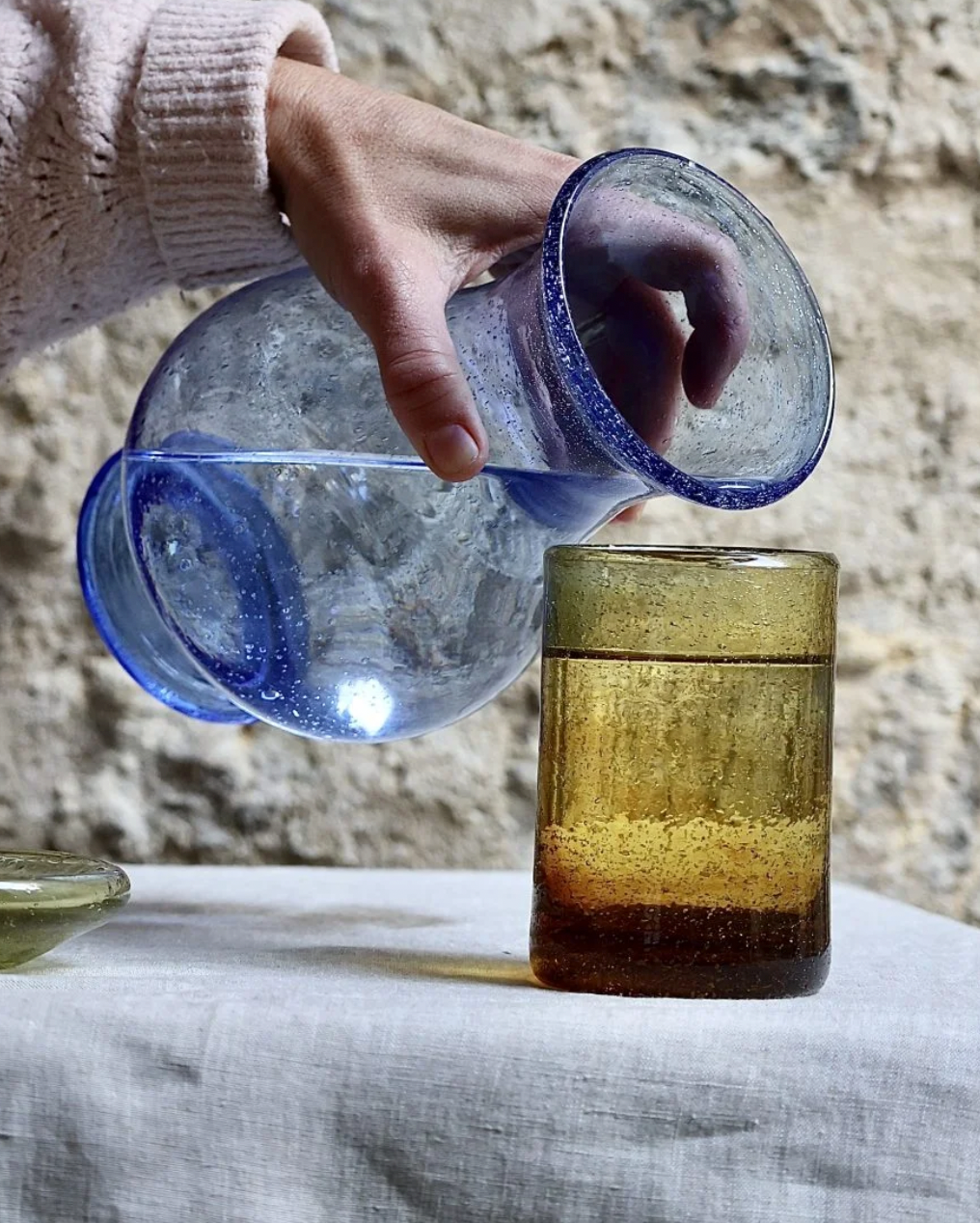 The Pichet Light Blue is mouth-blown from recycled glass and boasts a design that seamlessly blends classic beauty with modern utility. With its large round belly and graceful silhouette, it exudes sophistication and charm. The tapered neck and slight flare at the top make it easy to hold and pour your favorite beverages. But the Pichet is more than just a pitcher for drinks. Its versatile design allows it to double as a lovely vase, adding a touch of elegance to your floral arrangements and tablescapes. Whether adorning your dining table or brightening up a mantelpiece, the Pichet Light Blue effortlessly transitions between functional and decorative use.