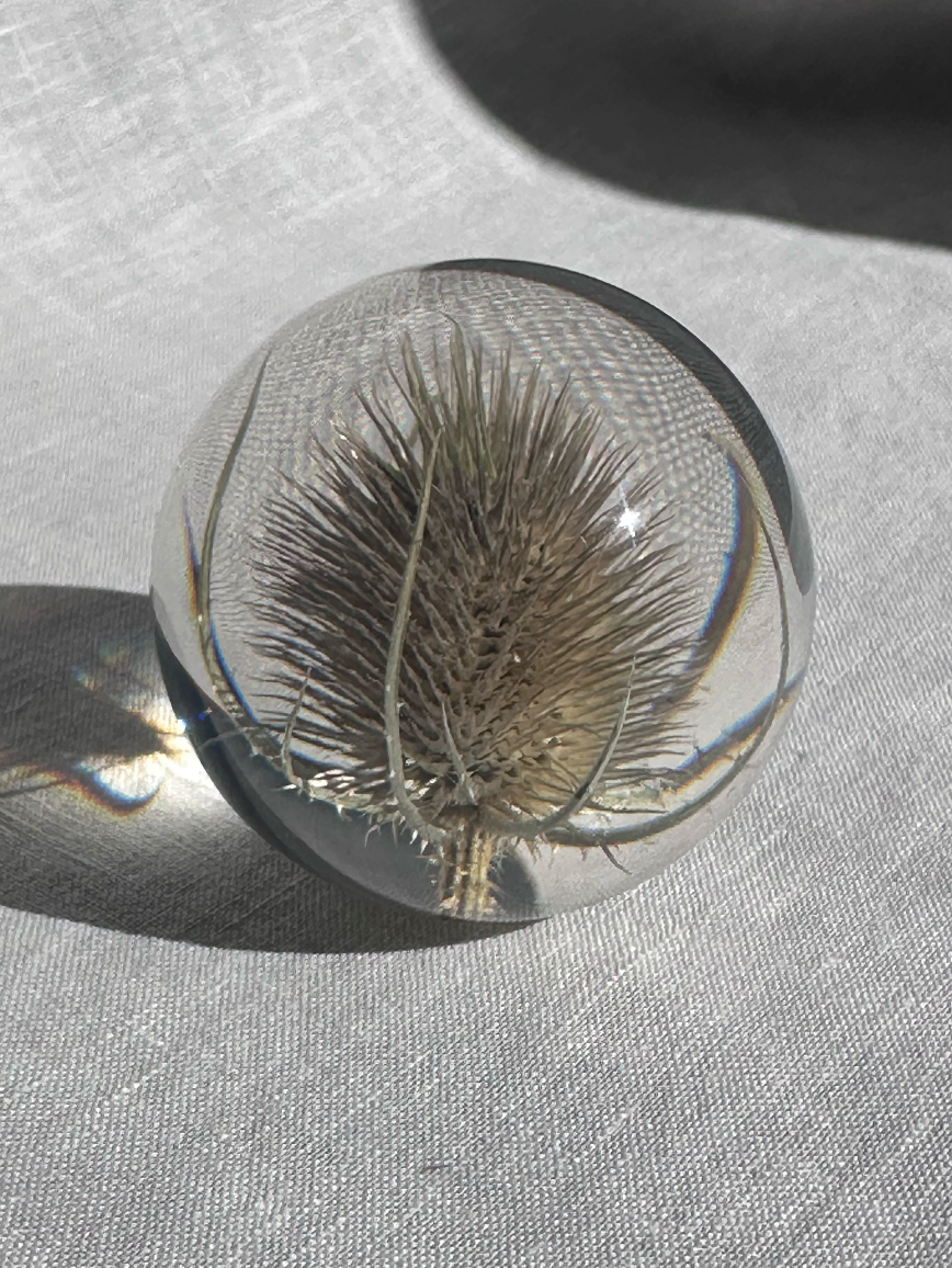 This beautiful teasel paperweight is made in England. A clear polyester resin, containing a UV filter to stop fading, is used to embed the botanical specimens without destroying them, as molten glass would, and the globe shape allows the specimen to be seen in its beauty from all angles.