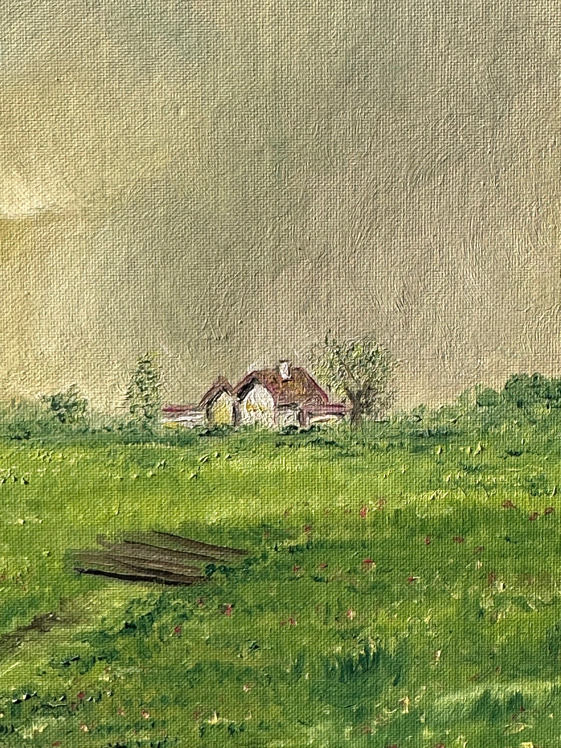 This oil painting on board presents a rural landscape anchored by a gnarled tree, its organic form commanding the composition while a modest cottage nestles in the distant field. The work captures the quiet charm of countryside scenery with technical precision, employing warm tonality and atmospheric perspective to create depth.