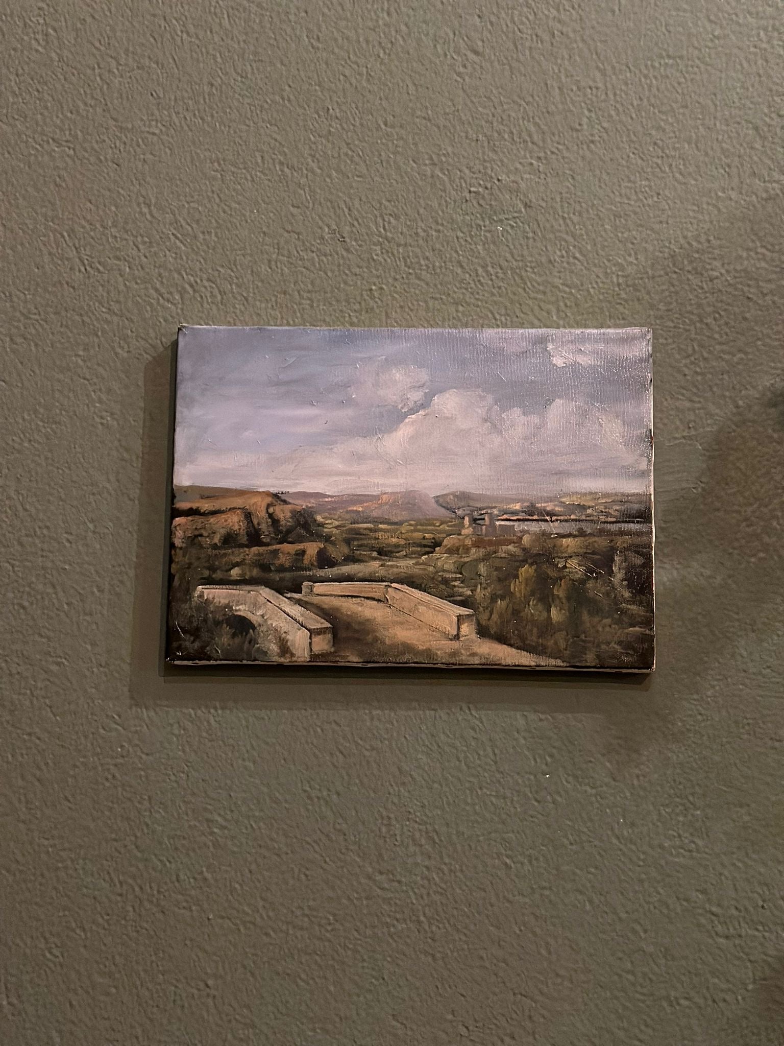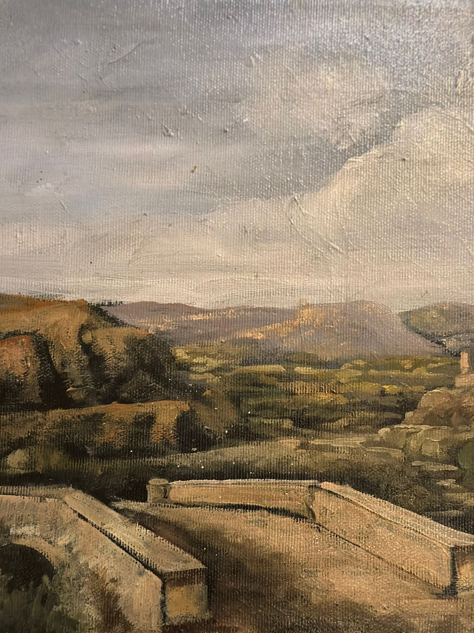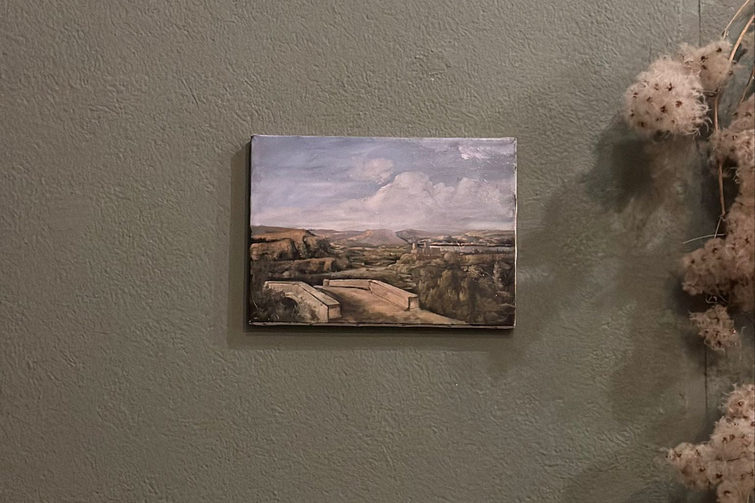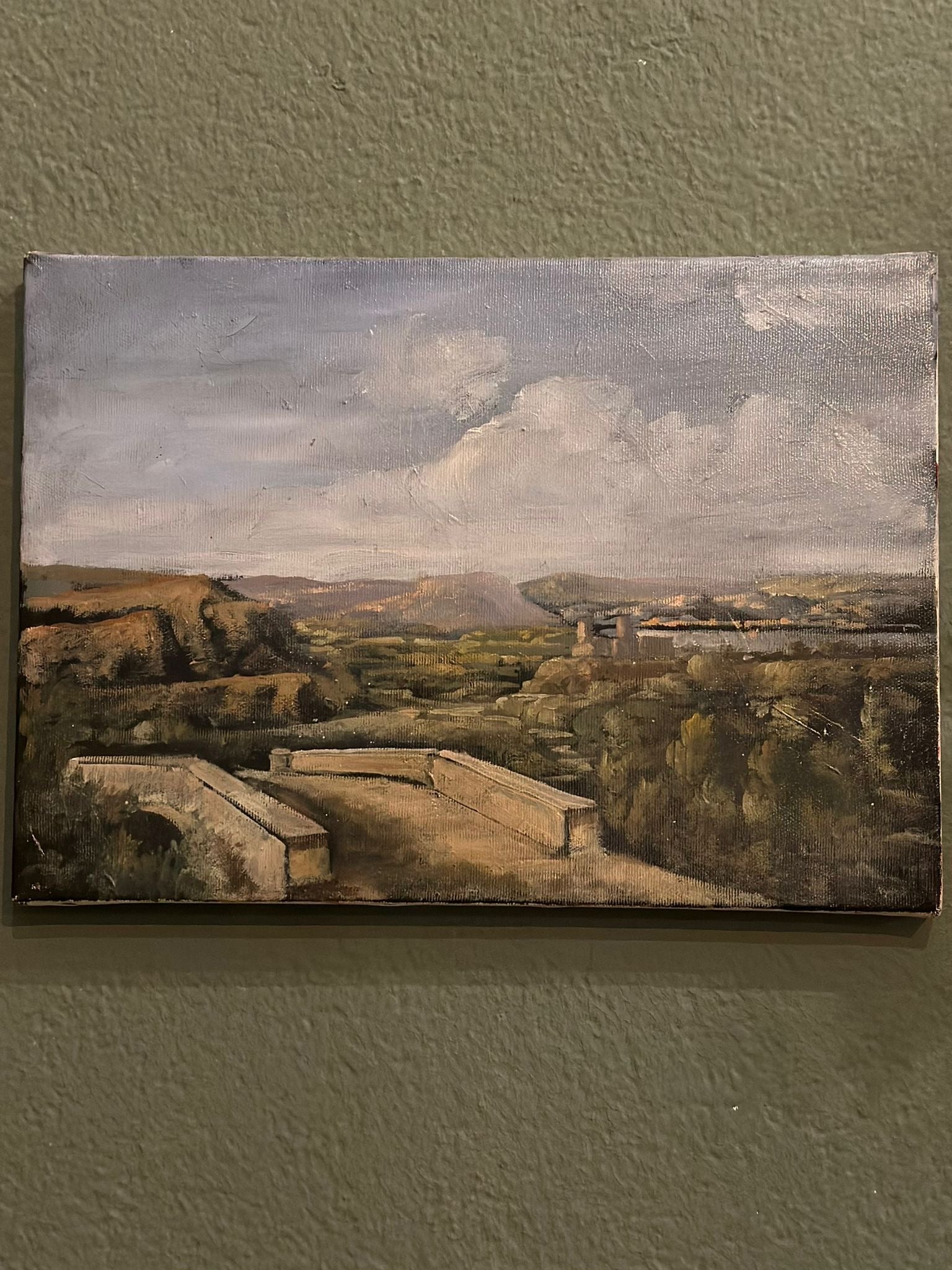 This beautifully painted landscape oil painting has a foreground focus on an ancient stone bridge and a tiny castle or church overlooking a lake. The soft sky allows for the small but of sunshine to peer through the day.