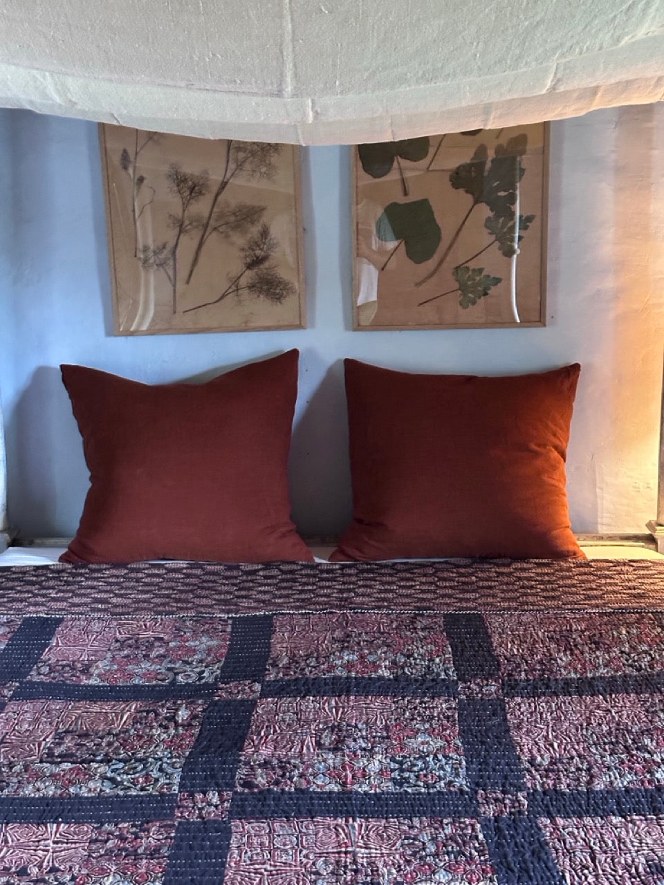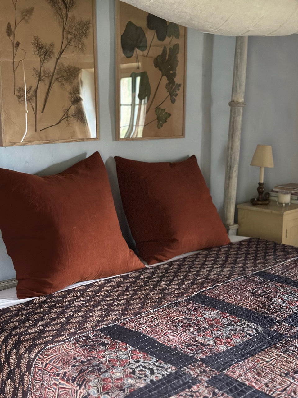 Each of our V.VM quilts is thoughtfully designed, drawing inspiration from time-honored quilting traditions. Handmade in India from recycled fabric scraps, they bring together vibrant patterns and hand block-printed cotton in a way that feels both timeless and unique. No two are ever the same, each piece is a true original.
