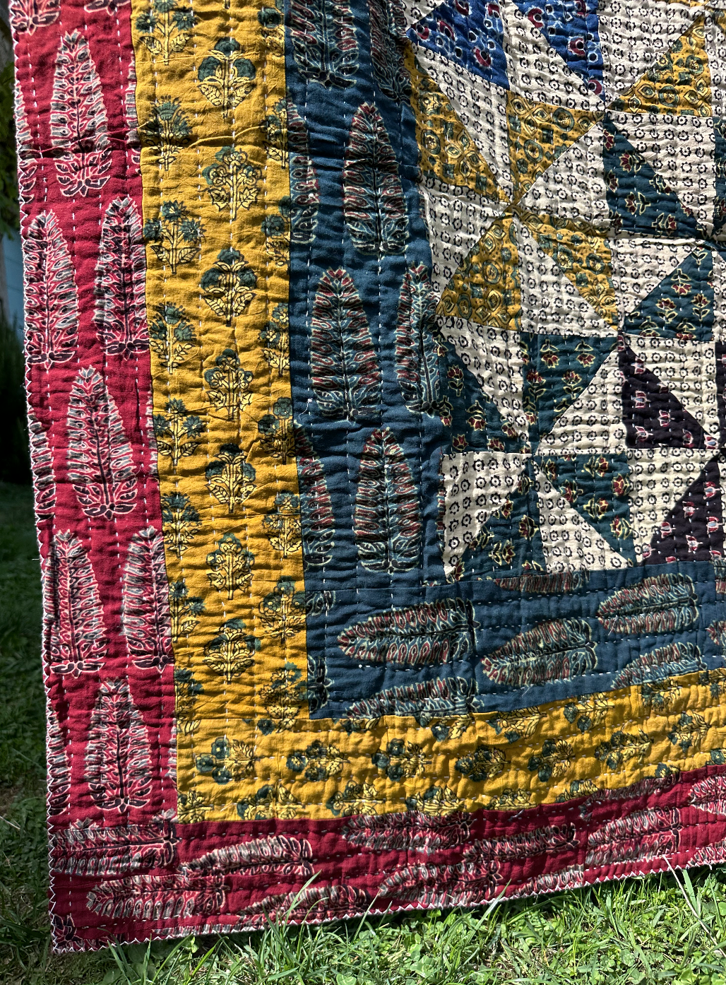 Each of our V.VM quilts is thoughtfully designed, drawing inspiration from time-honored quilting traditions. Handmade in India from recycled fabric scraps, they bring together vibrant patterns and hand block-printed cotton in a way that feels both timeless and unique. No two are ever the same, each piece is a true original.
